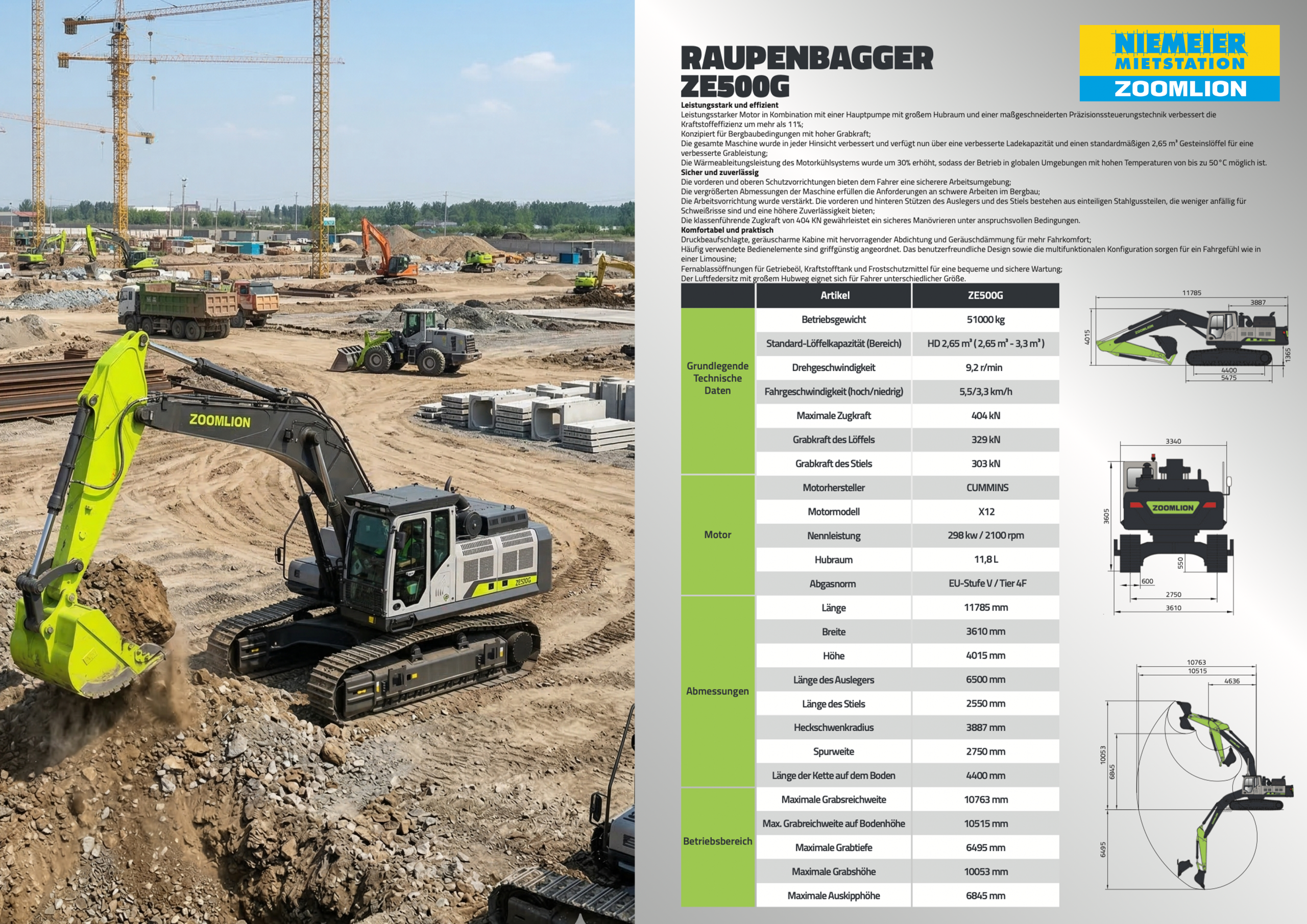 Der Zoomlion Bagger ZE500G überzeugt durch hohe Leistung, Effizienz und Zuverlässigkeit im anspruchsvollen Baustelleneinsatz. Der angepasste Motor bietet hohes Drehmoment, starke Leistung sowie einen stabilen Hydraulikdurchfluss. Ein fortschrittliches Steuersystem ermöglicht die präzise Regelung von Drehmoment und Durchfluss und trägt so zu einer verbesserten Kraftstoffeffizienz bei.