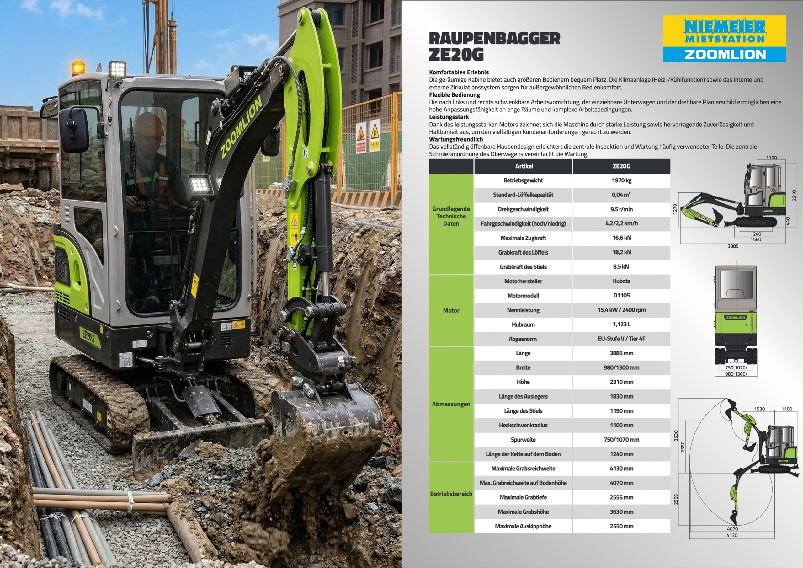 Der Zoomlion Mini-Bagger ZE20G überzeugt durch robuste Bauweise, hohe Zuverlässigkeit und effizientes Arbeiten auf engem Raum. Die serienmäßige FOPS/ROPS-Kabine sowie die verstärkte Schaufel sorgen für Sicherheit, Langlebigkeit und Stabilität im täglichen Einsatz. Ein kundenspezifisch abgestimmtes Hydrauliksystem mit präziser Lasterfassung verbessert die Arbeitseffizienz und ermöglicht feinfühliges, kontrolliertes Arbeiten.
