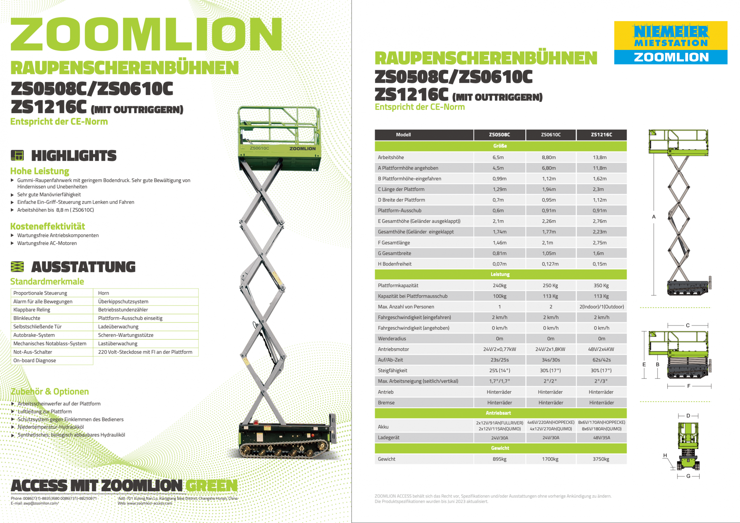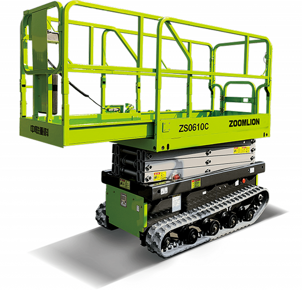 Die Zoomlion Scherenhebebühne ZS0610C kombiniert hohe Leistungsfähigkeit mit maximaler Geländegängigkeit und Wirtschaftlichkeit. Dank der gummierten Raupenfahrwerke bietet die Scherenarbeitsbühne einen geringen Bodendruck sowie hervorragende Hindernisüberwindung und eignet sich ideal für unebene Untergründe und anspruchsvolle Einsatzbedingungen. Die Pivot-Lenkung sorgt für hohe Wendigkeit, während die einfache Einhebelsteuerung präzises Fahren und Arbeiten ermöglicht.