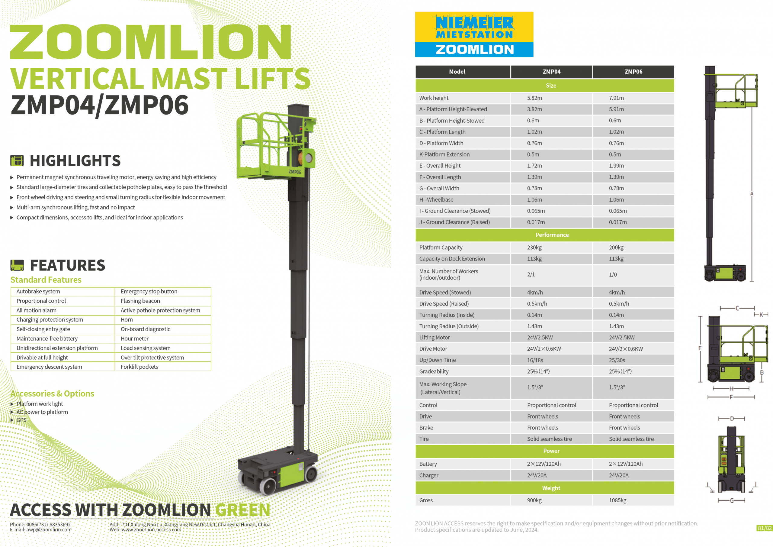 Umfangreiche Sicherheits- und Komfortfunktionen wie proportionale Steuerung, automatische Bremse, Notablass- und Not-Aus-Systeme, Neigungsschutz sowie Lastüberwachung sorgen für einen zuverlässigen Betrieb. Eine ausziehbare Plattform, integrierte Diagnostik und optionale Ausstattungen wie AC-Stromversorgung auf der Plattform oder GPS machen die ZMP06 zu einer vielseitigen Lösung für Wartungs-, Montage- und Servicearbeiten im Innenbereich.